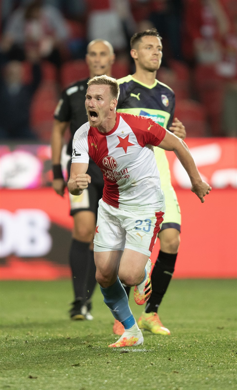 Utkání nadstavby 1. fotbalové ligy: SK Slavia Praha - FC Viktoria Plzeň. Petr Ševčík ze Slavie se raduje z gólu.