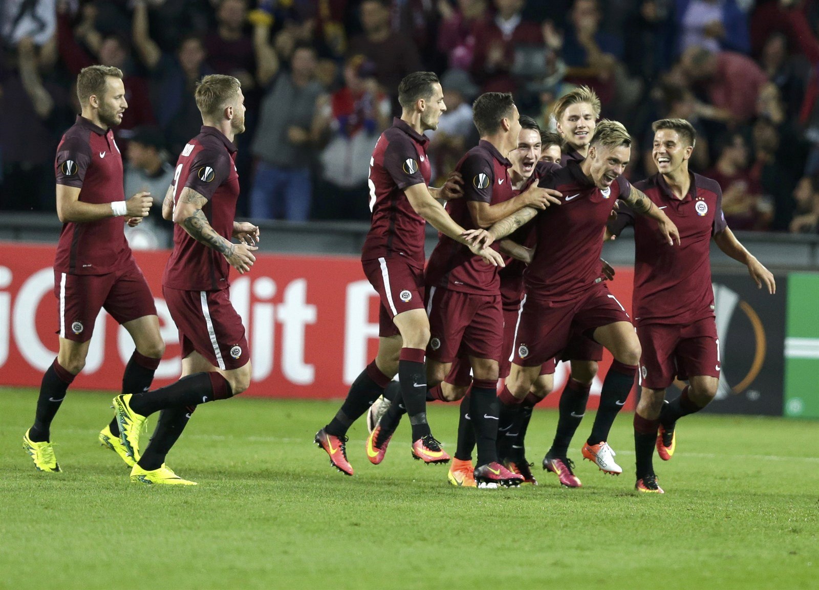 Radost sparťanů po prvním gólu v síti Interu (uprostřed autor branky Václav Kadlec).