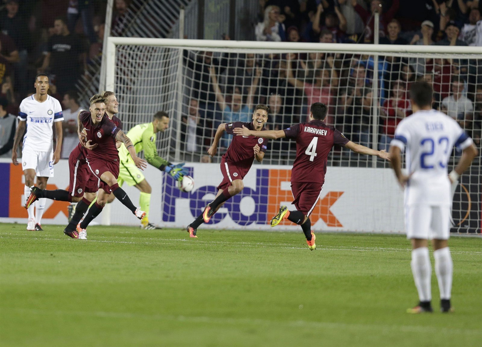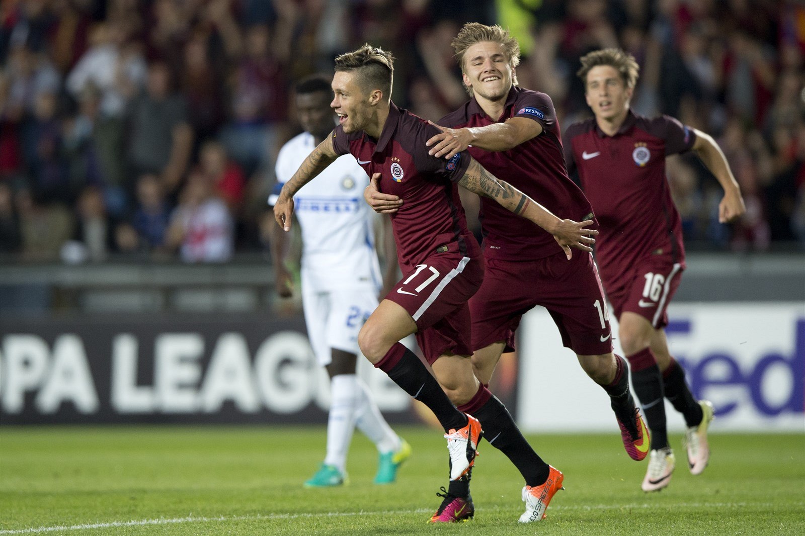 AC Sparta Praha - Inter Milán. Václav Kadlec s Martinem Frýdkem slaví první branku v síti hostí.