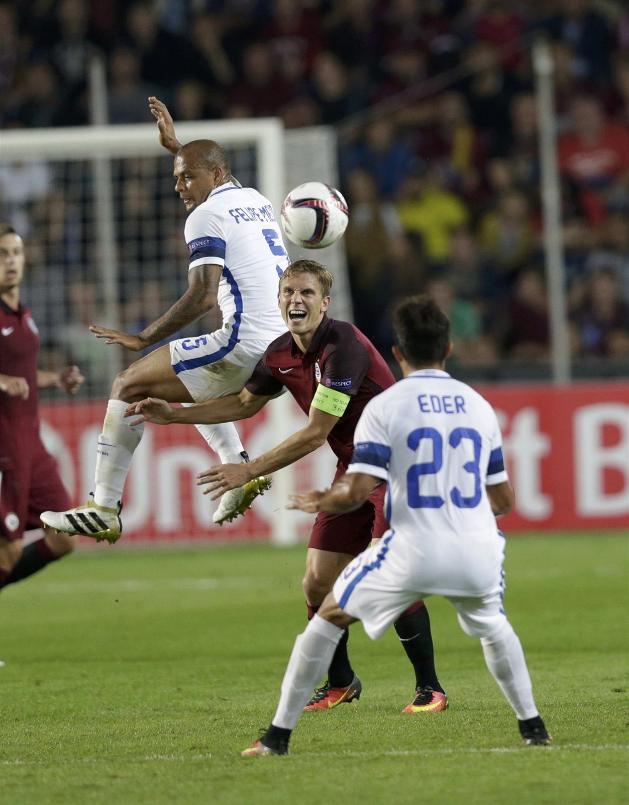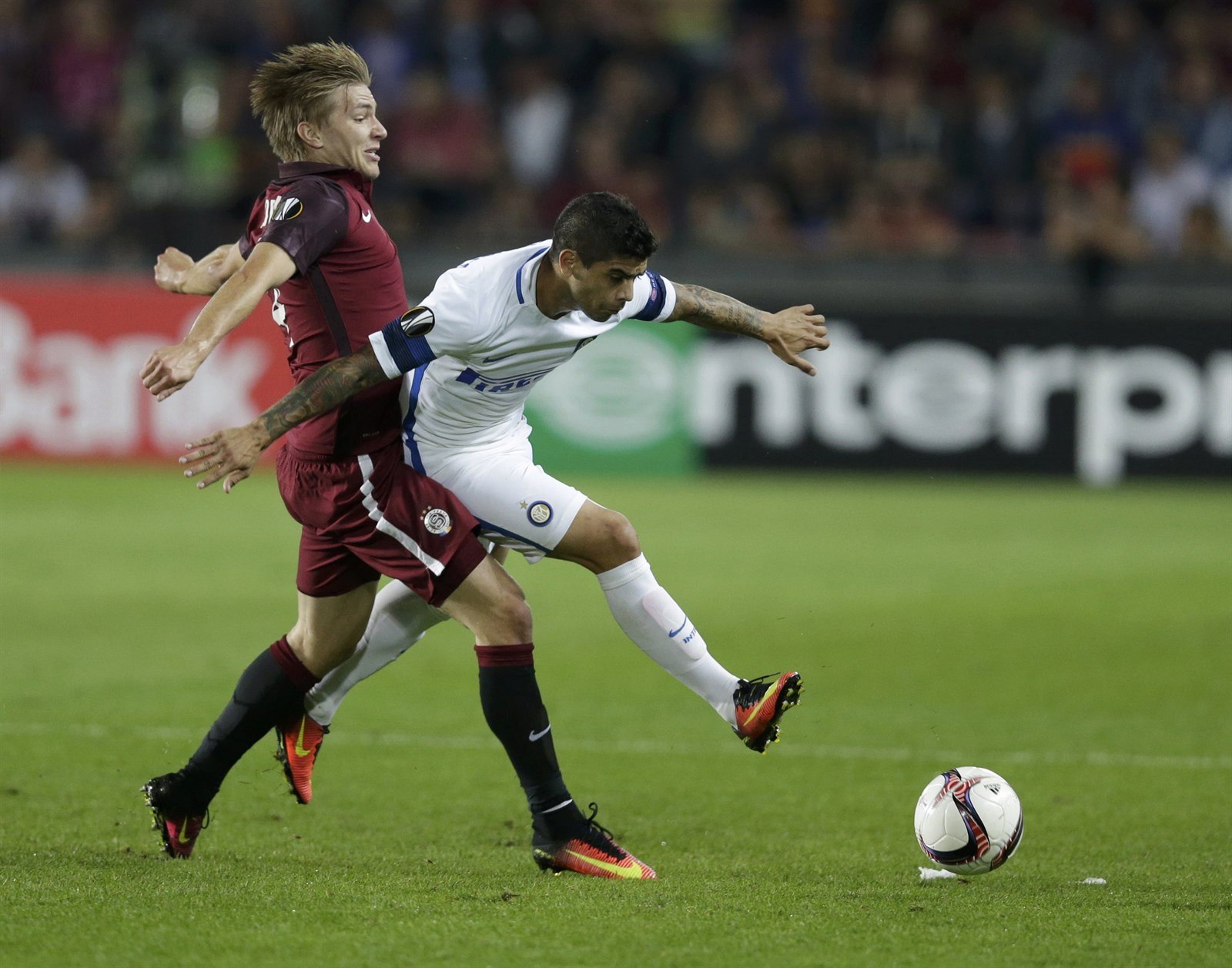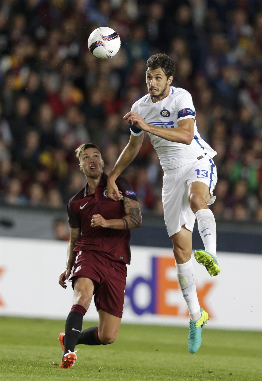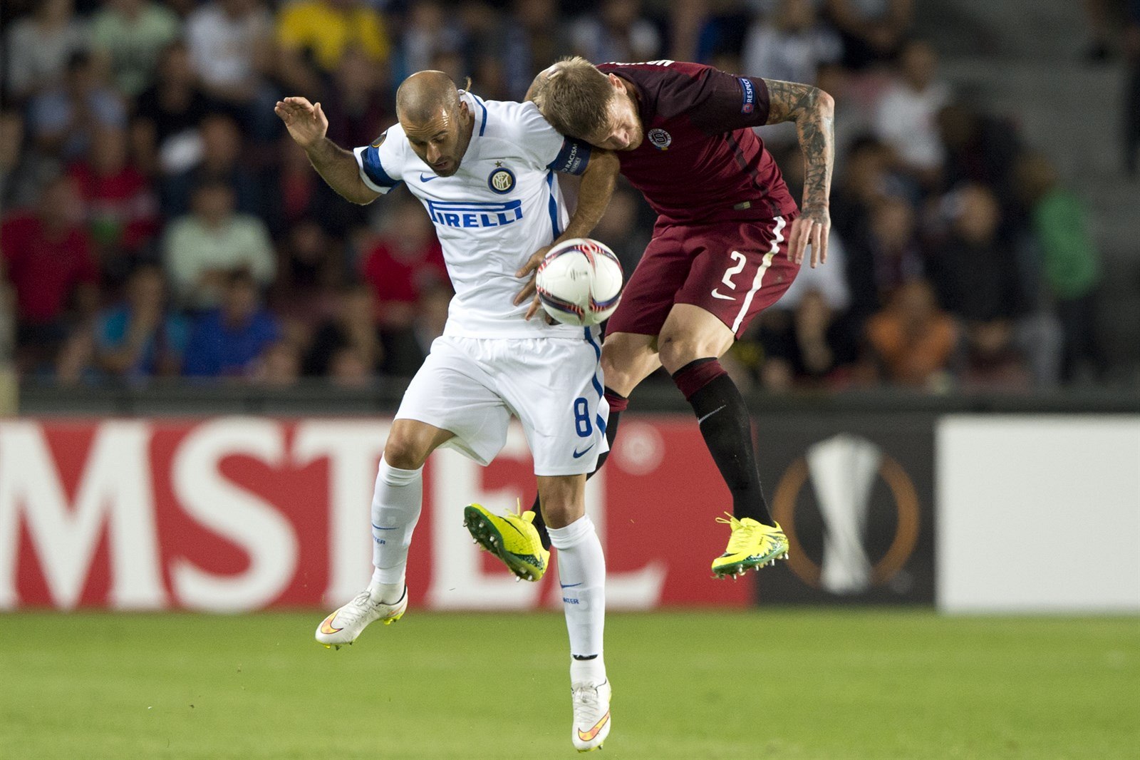 Sparta vs. Inter Milán (Dočkal bojuje o míč s Felipem Melem a Ederem).