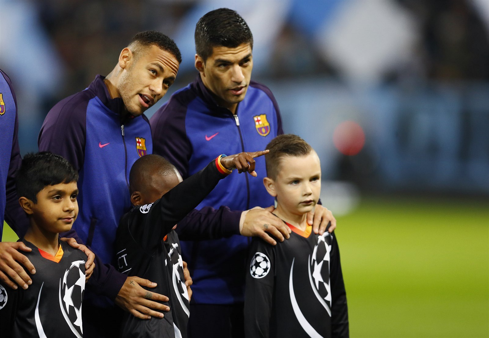 Neymar a Luis Suárez před zápasem Barcelony s Manchesterem City.
