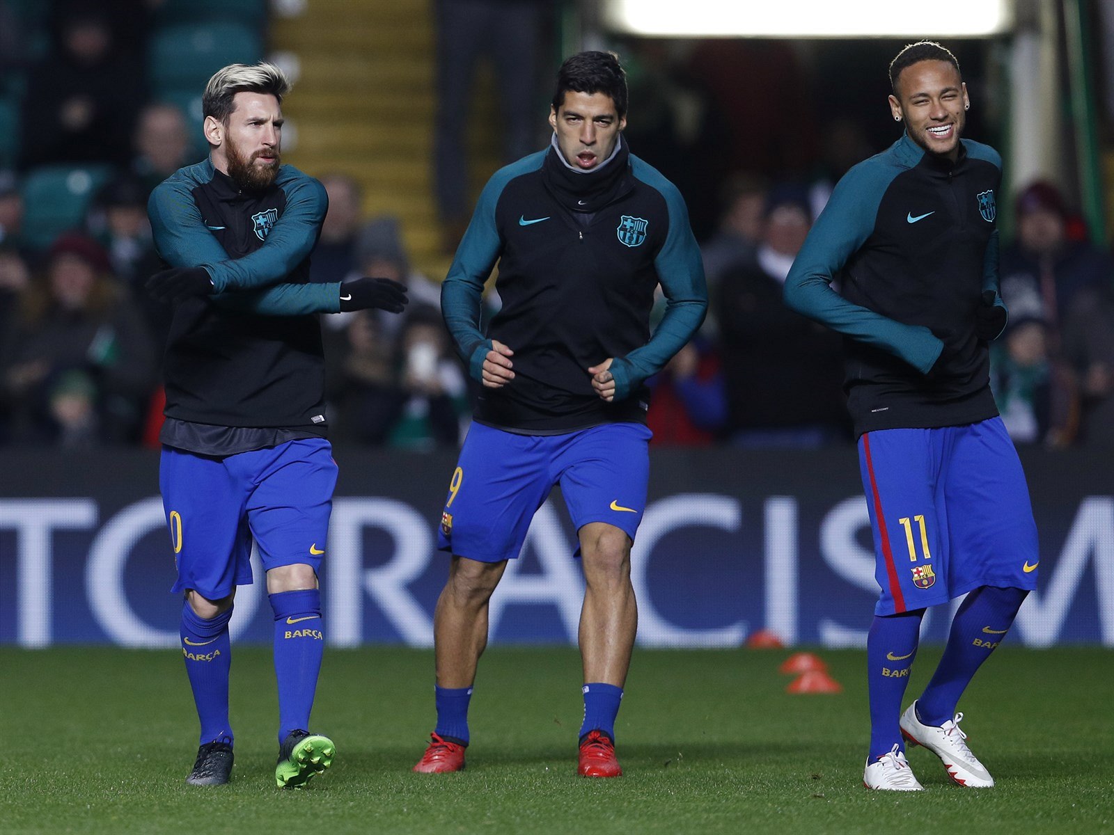 Messi, Suárez a Neymar se rozcvičují před utkáním Barcelony s Celticem.