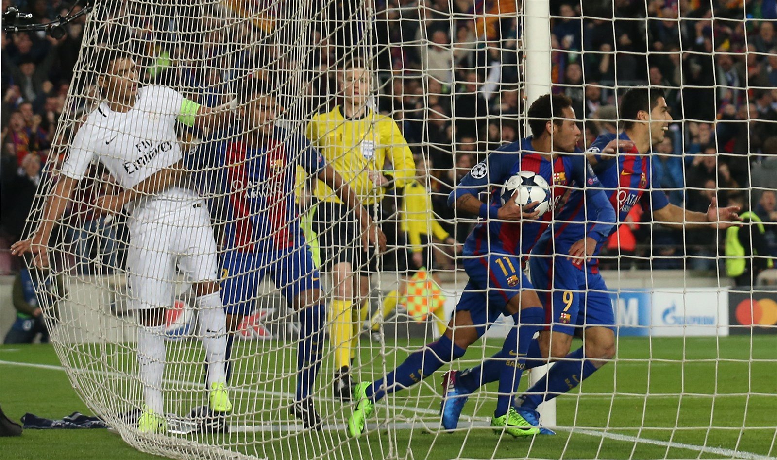 Osmifinále Ligy mistrů Barcelona - Paris St. Germain (Neymar a Suárez slaví gól)