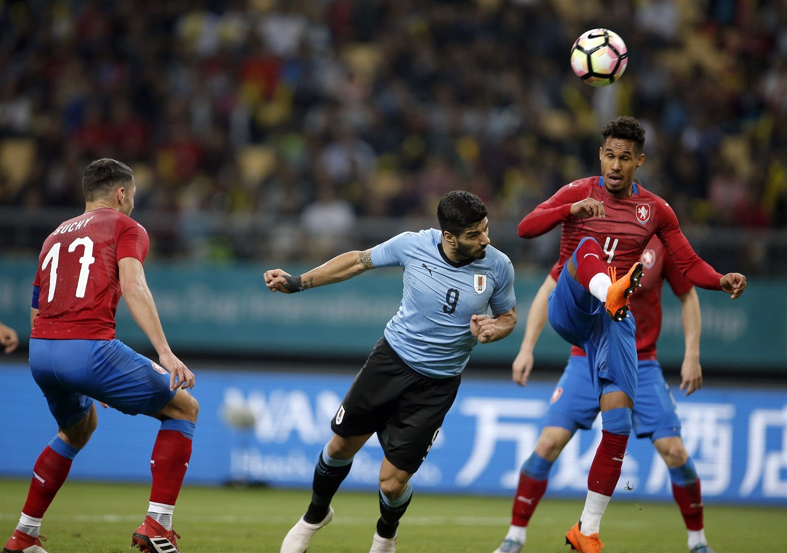 ČR vs. Uruguay: Luis Suaréz hlavičkuje, Theodor Gebre Selassie se mu v tom snaží zabránit, vše sleduje Marek Suchý.