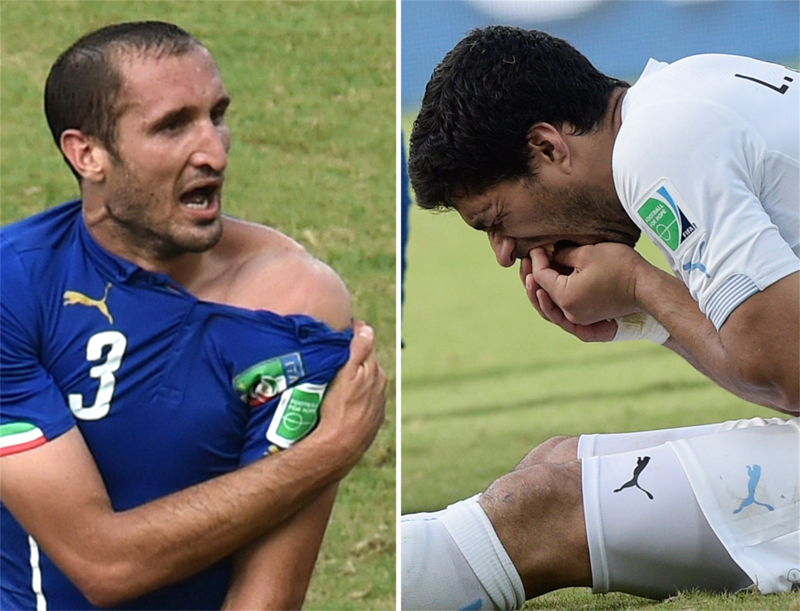 Nejzvláštnější moment světového šampionátu 2014. Uruguayec Suárez právě „kousl“ Itala Chieliniho.