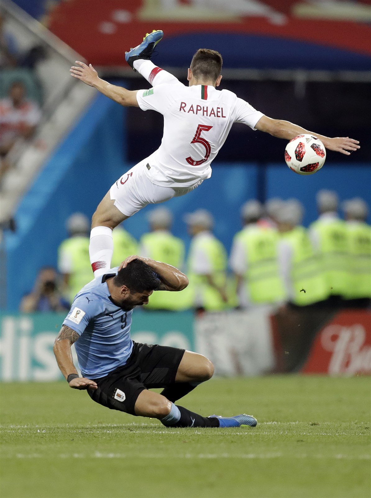 MS ve fotbale 2018, Uruguay vs. Portugalsko: souboj Raphaela Guerreira a Luise Suáreze.