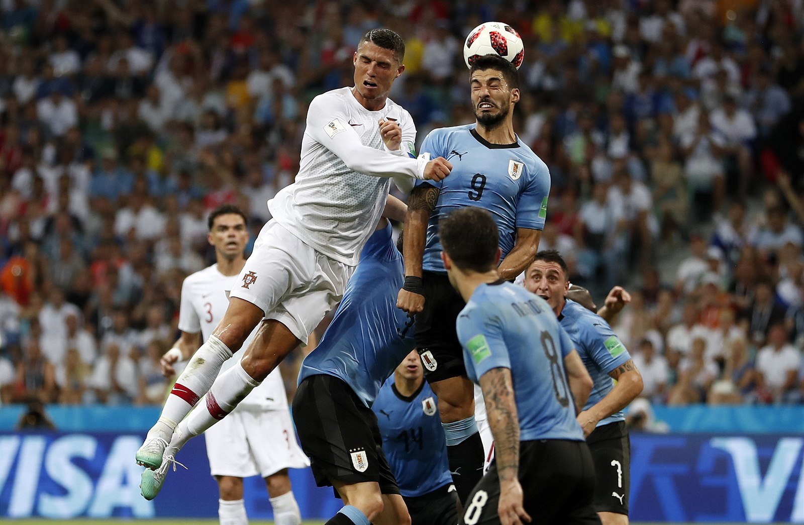 MS ve fotbale 2018, Uruguay vs. Portugalsko: hlavičkový souboj Ronalda a Suáreze.