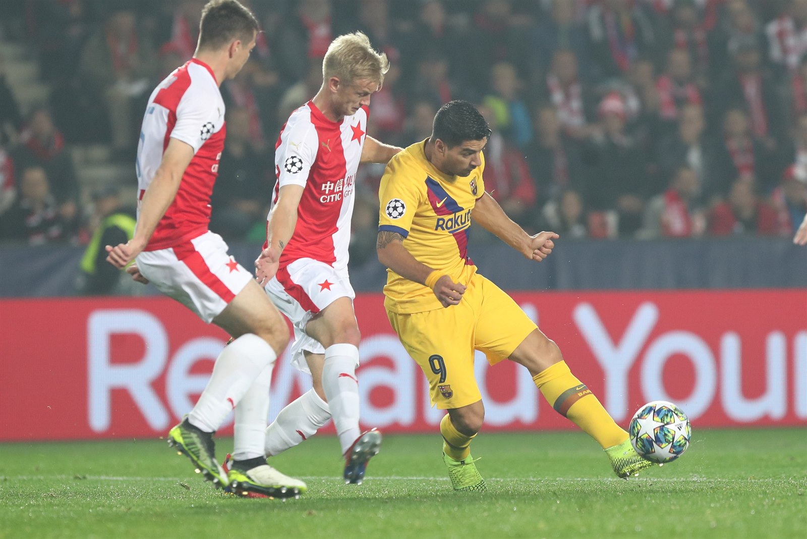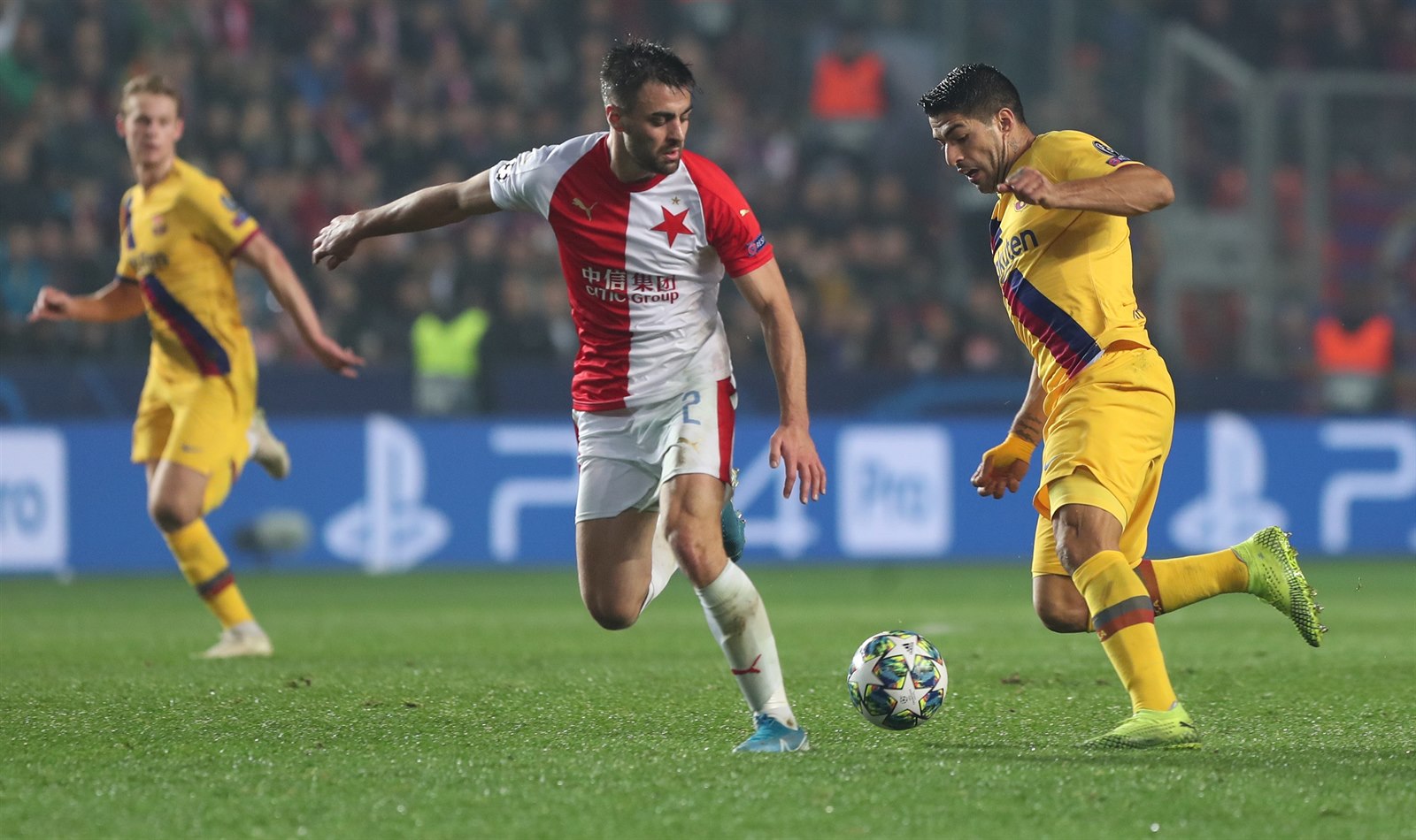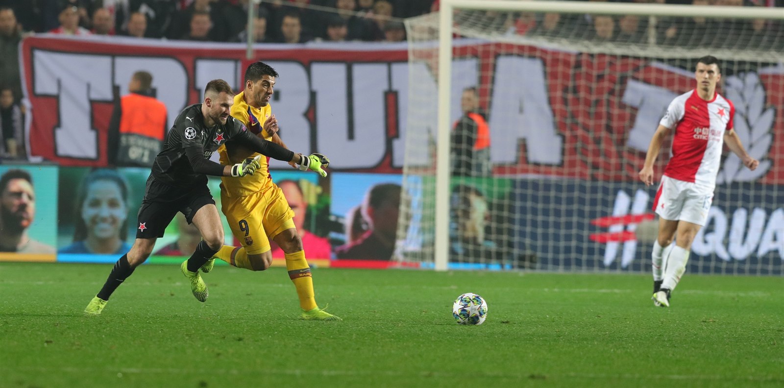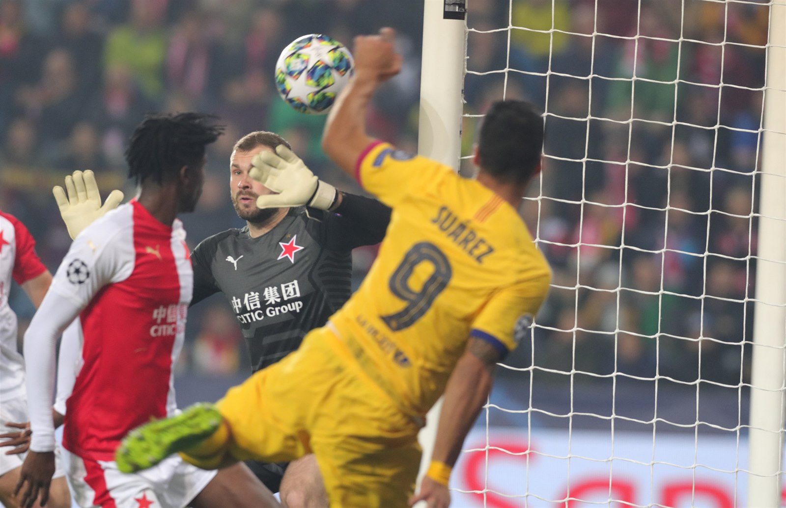 Nechybělo moc a brankář Slavie přišel na úkor Luise Suaréze o míč.
