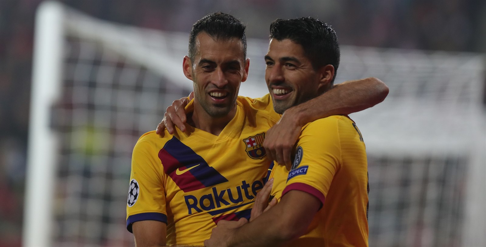 Luis Suaréz slaví spolu s Busquetsem vedení 2:1.