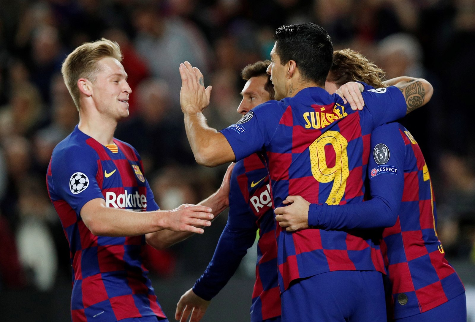 Lionel Messi a Luis Suarez slaví vítězství v Lize mistrů.