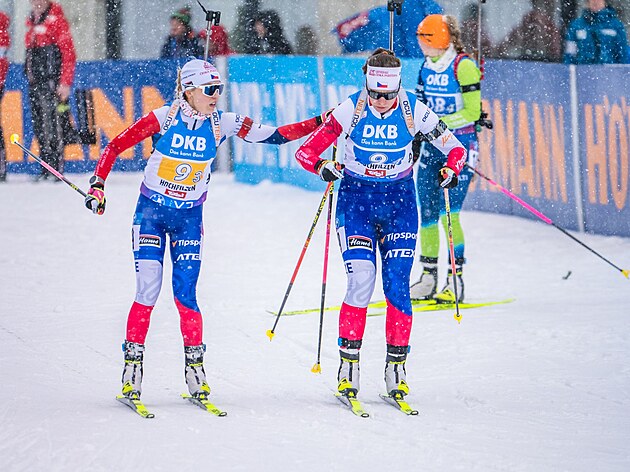 Tereza Voborníková předává štafetu Kristýně Otcovské během závodu žen v Hochfilzenu.