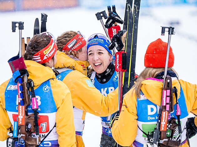 Franziska Preussová slaví s německými biatlonistkami vítězství ve štafetě v Hochfilzenu.