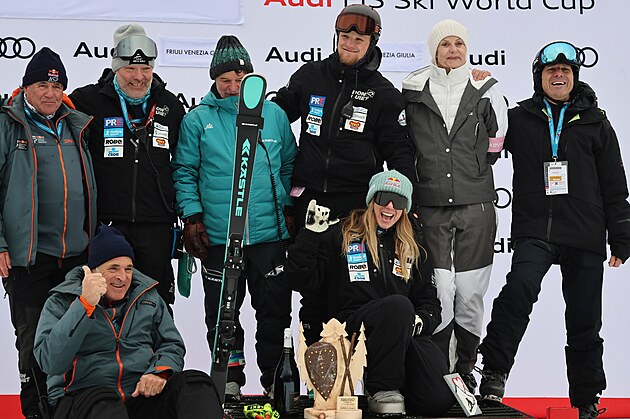 Ester Ledecká slaví se svým týmem v Tarvisiu třetí místo v super-G.