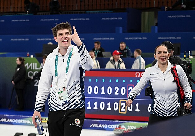 Pár českých curlerů Vít Chabičovský a Julie Zelingrová slaví první vítězství po utkání s Jižní Koreou. (7. února 2026)
