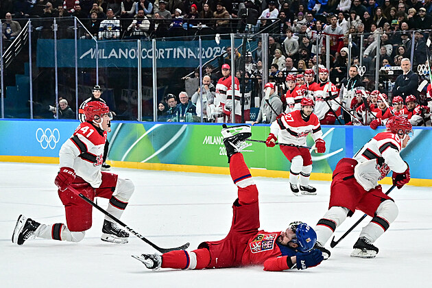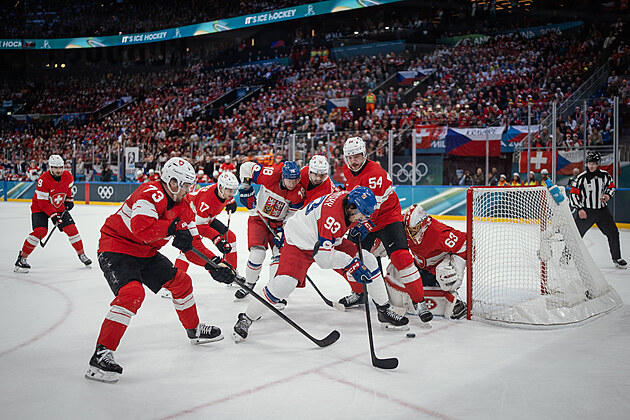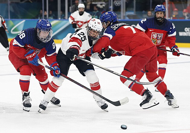 Hokejisté Matěj Stránský, Christian Marti Sandro Schmid v akci v zápase Česko vs. Švýcarsko. (15. února 2026)