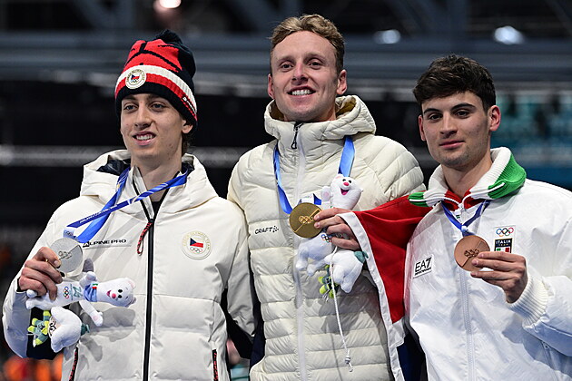 Zlatý medailista Sander Eitrem z Norska slaví na stupních vítězů po boku Metoděje Jílka a bronzového Riccarda Lorella z Itálie. (8. února 2026)