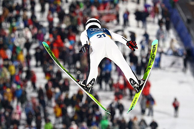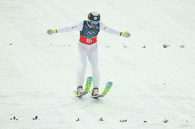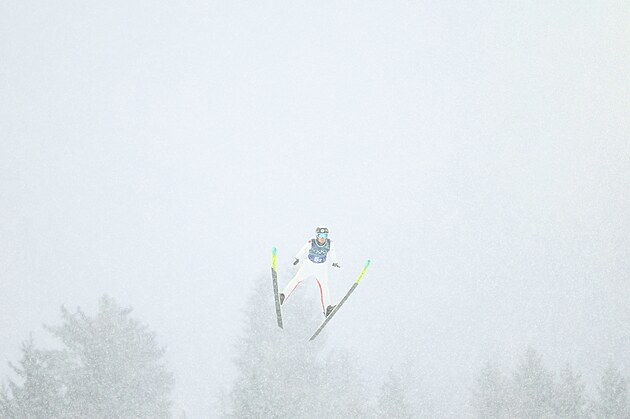 Jiří Konvalinka z České republiky v akci během kvalifikačního kola skoků na lyžích. (19. února 2026)