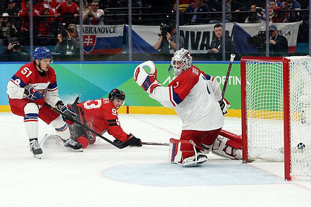 Mitch Marner překonává Lukáše Dostála a posouvá Kanadu do semifinále.