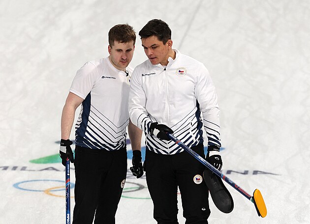 Lukáš Klípa a Marek Černovský z České republiky během zápasu curlingu proti Švédsku. (19. února 2026)
