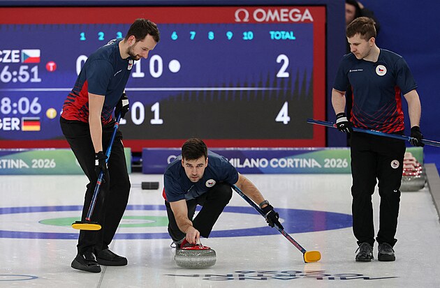 Lukáš Klípa, Lukáš Klíma, Marek Černovský a Martin Jurík z České republiky během zápasu curlingu proti Číně. (18. února 2026)