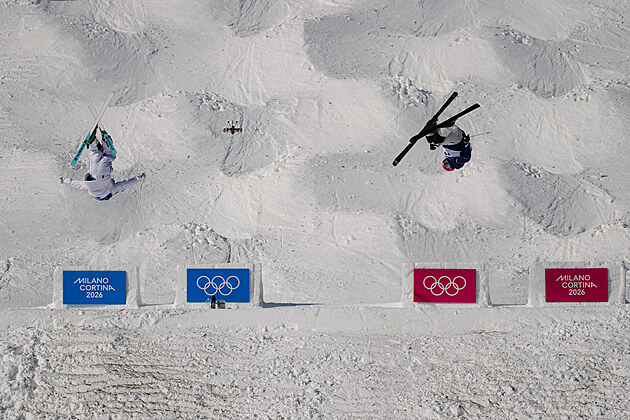 Mikael Kingsbury z Kanady v akci s Matyášem Kroupou (27) z České republiky během závodu mužů v jízdě v boulích. (15. února 2026)