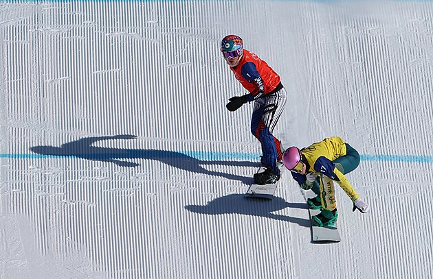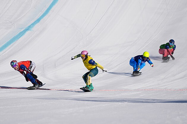 Česká reprezentantka Eva Adamczyková (v červeném) během semifinále ve snowboardcrossu. (13. února 2026)