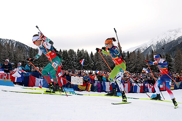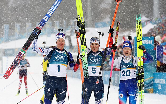 Vítězka Océane Michelonová z Francie, druhá Francouzka Julia Simonová a třetí Češka Tereza Voborníková po závodě biatlonistek s hromadným startem. (21. února 2026)