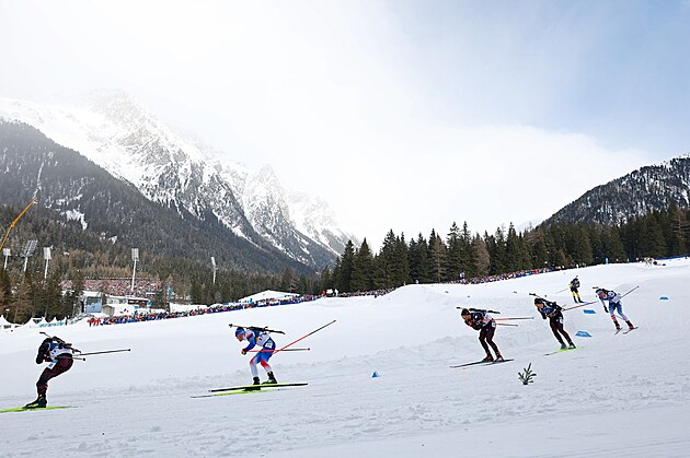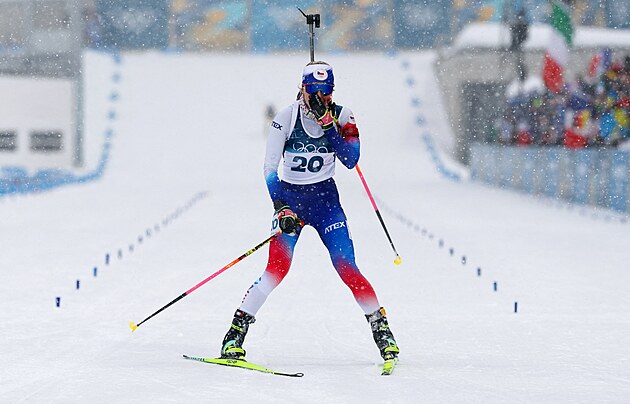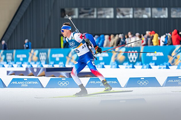 Michal Krčmář (27) z České republiky v akci během mužského hromadného startu na 15 km. (20. února 2026)