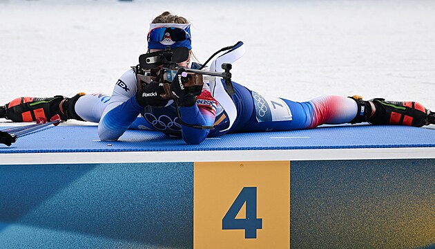 Tereza Vinklárková při střelbě vleže v olympijském štafetovém závodu biatlonistek. (18. února 2026)