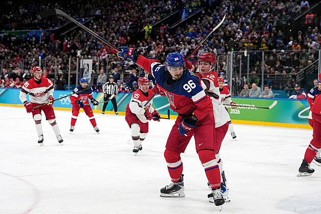 Český útočník David Tomášek v akci v olympijském osmifinále proti Dánsku.