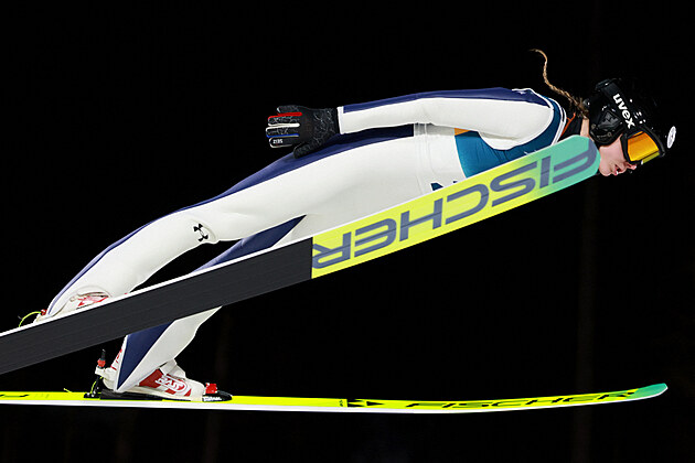 Češka Anežka Indráčková během finálového kola skoku na lyžích. (15. února 2026)