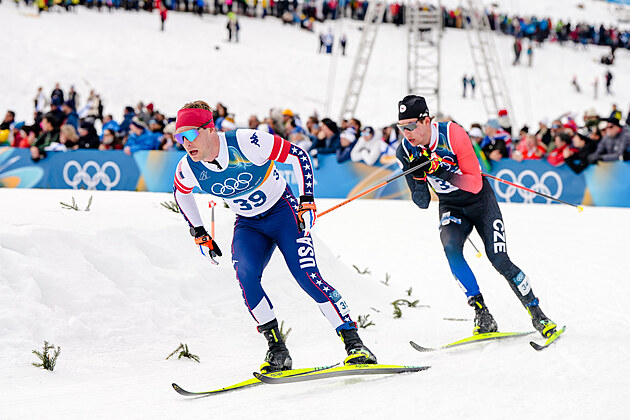 Hunter Wonders z USA a za ním Čech Matyáš Bauer ve finále běžkařského závodu. (21. února 2026)