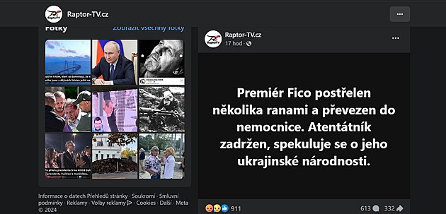 Téměř ihned po atentátu na slovenského premiéra Roberta Fica zahltily sociální sítě dezinformace. Například Raptor TV, která natáčí akce dezinformační scény a server Hlídací pes v roce 2020 upozornil, že její majitel Žarko Raptor Jovanovič spolupracoval s ruskou armádní televizí Zvezda, vypustila příspěvek se spekulací, že by za útokem mohl stát Ukrajinec.