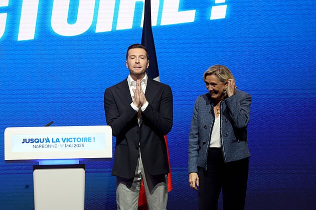 Jordan Bardella a Marine Le Penová na sjezdu strany ve městě Narbonne (1. května 2025)