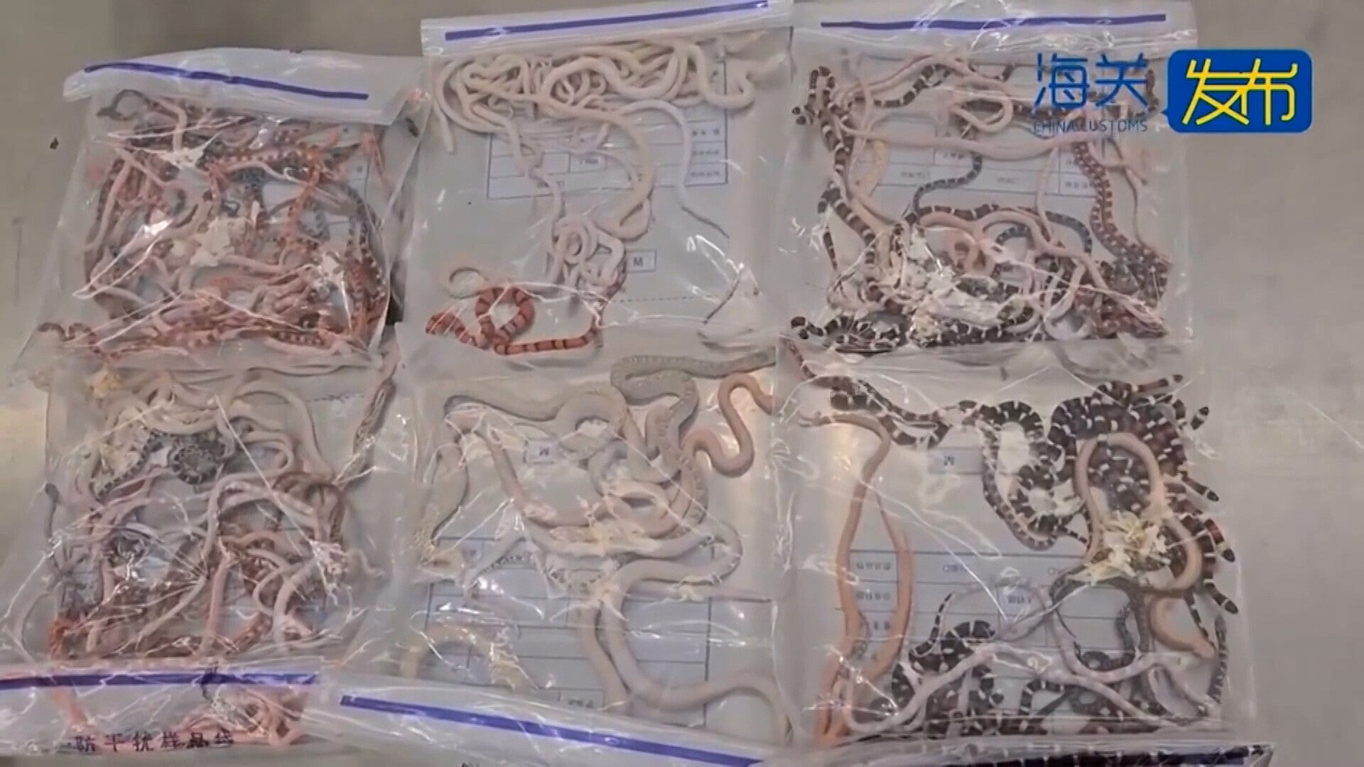 „Při bližším ohledání celníci zjistili, že kapsy kalhot, které měl dotyčný na sobě, byly přelepené lepicí páskou a skrývalo se v nich šest plátěných pytlů. Když pytle pracovníci otevřeli, objevili uvnitř živé hady všech druhů, velikostí i barev,“ stojí ve zprávě celní správy.