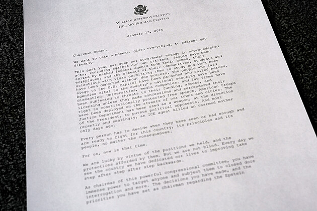 Kopie dopisu bývalého prezidenta Billa Clintona a bývalé ministryně zahraničí Hillary Clintonové zaslaného Kongresu v rámci vyšetřování týkajícího se Jeffreyho Epsteina a osob s ním spojených. (13. ledna 2026)