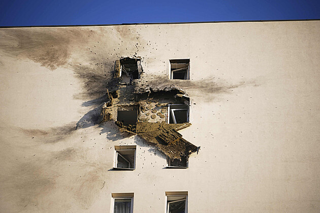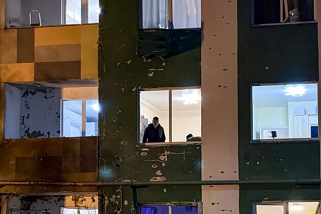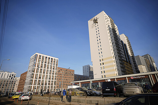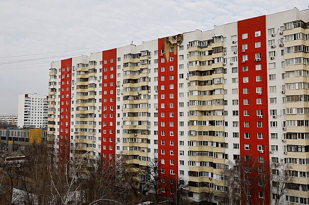 Pohled na několikapatrovou obytnou budovu poškozenou při útoku ukrajinského dronu v Moskvě. (11. března 2025)