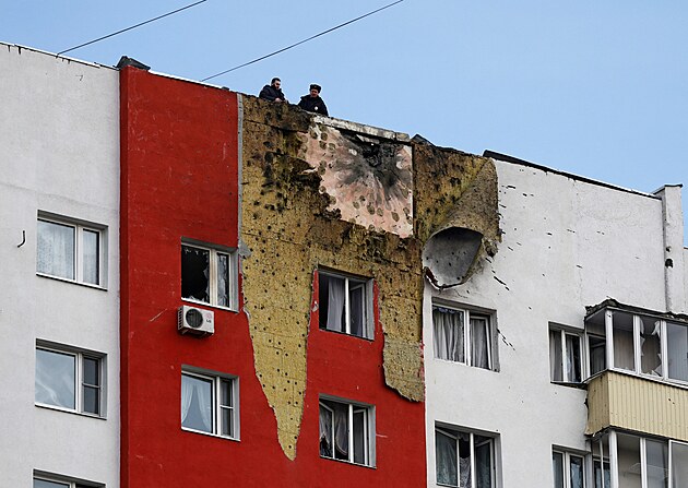 Policisté stojí na střeše vícepodlažního obytného domu poškozeného při útoku ukrajinského dronu v Moskvě. (11. března 2025)