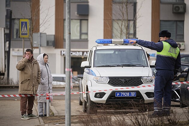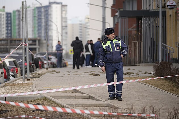 Policista hlídkuje v ruské vesnici Sapronovo u Moskvy v blízkosti obytného domu, kam spadl sestřelený ukrajinský dron. (11. března 2025)