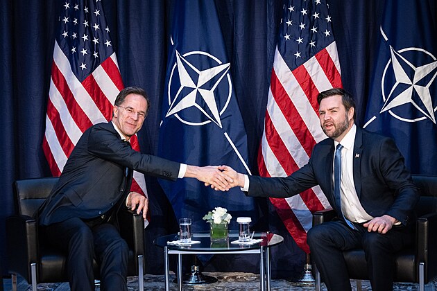Generální tajemník NATO Mark Rutte (vlevo) a americký viceprezident J. D. Vance (14. února 2025)