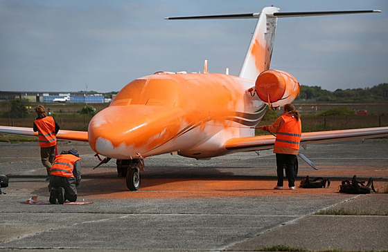 Klimatičtí aktivisté vtrhli do areálu letiště a oranžovou barvou tam postříkali zaparkovaný soukromý letoun. Barva zatekla i do motoru stroje, takže škoda se nakonec vyšplhala na více než milion eur.