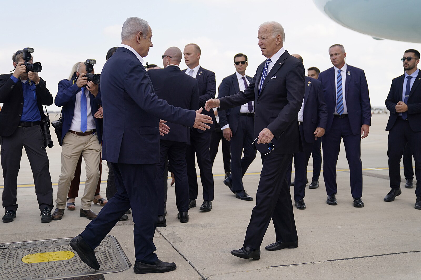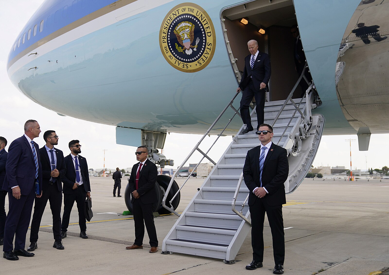 Prezident USA Joe Biden přiletěl do Tel Avivu. Na letišti ho přivítali izraelský premiér Benjamin Netanjahu a prezident Jicchak Herzog. (18. října 2023)