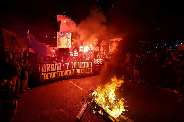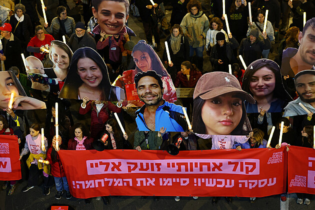 Podle agentury DPA v sobotu večer znovu vyšly do ulic velkých měst tisíce Izraelců a požadovaly dohodu o propuštění rukojmích, které radikálové z teroristického hnutí Hamás unesli do Pásma Gazy. (4. ledna 2024)