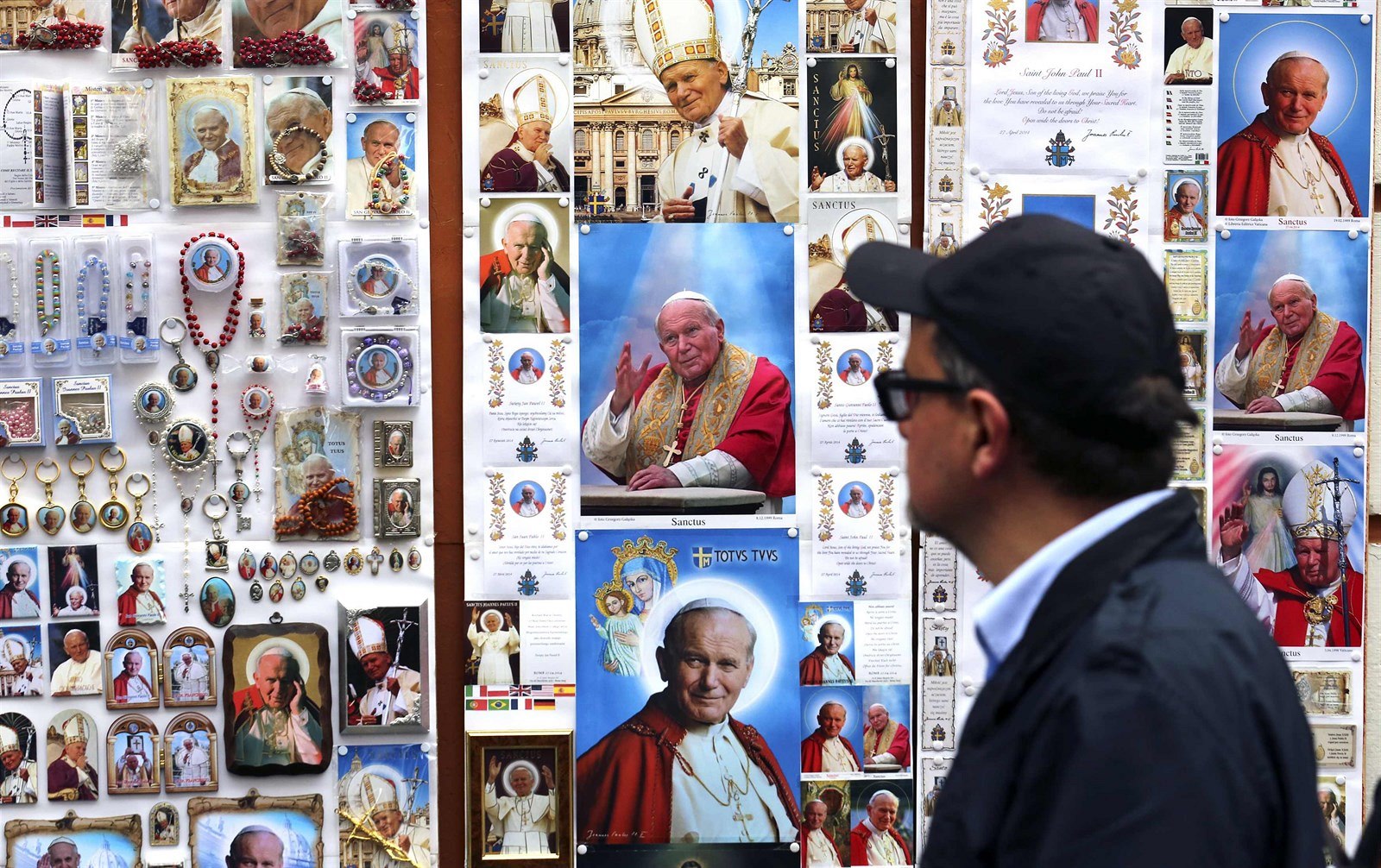 Řím se chystá na svatořečení dvou papežů. Pohlednice a portréty zachycují Jana Pavla II. (23. dubna 2014)