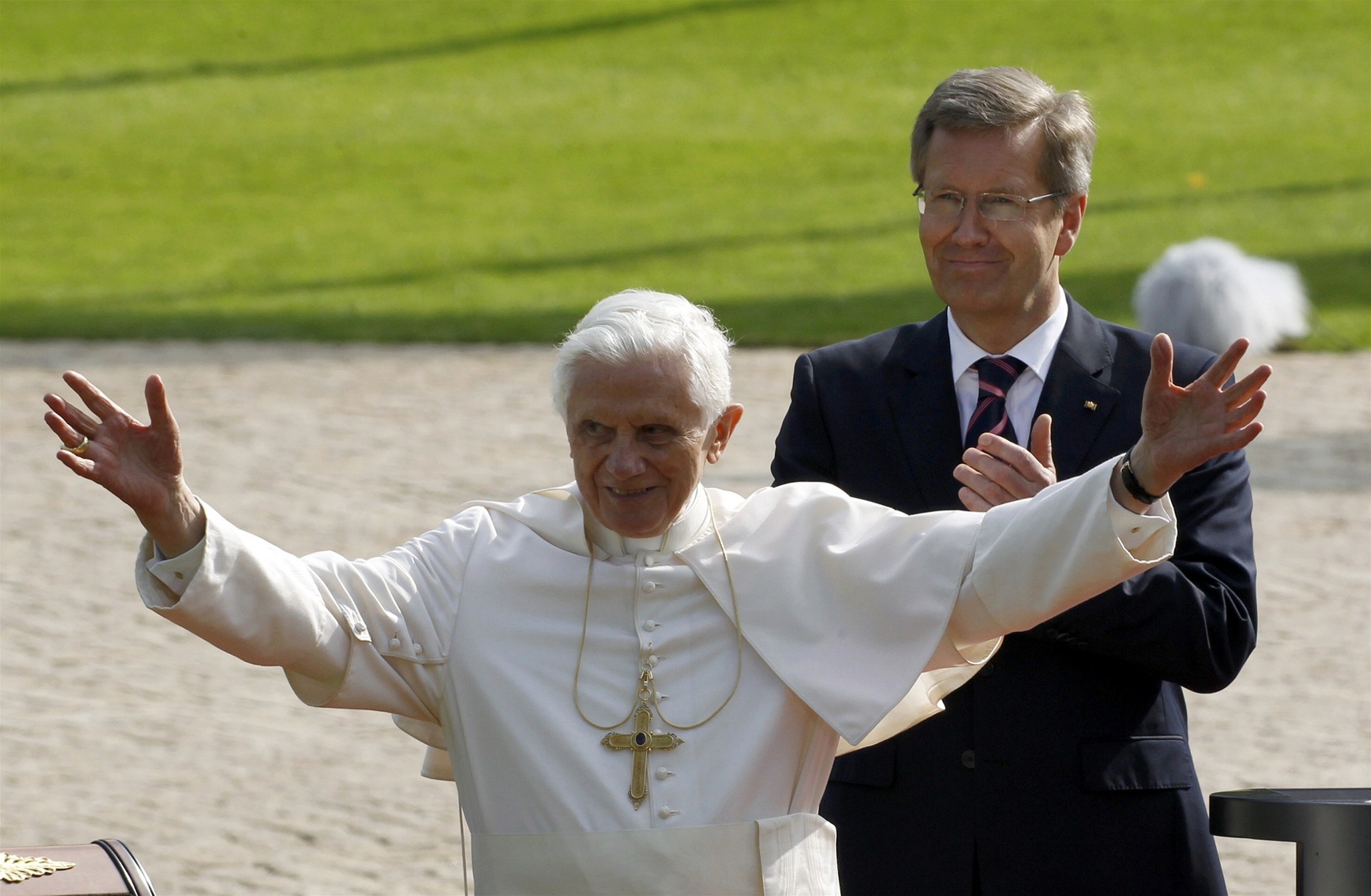 Papež Benedict XVI během vítací ceremonie v Berlíně. Vedle něj stojí prezident Wulff.