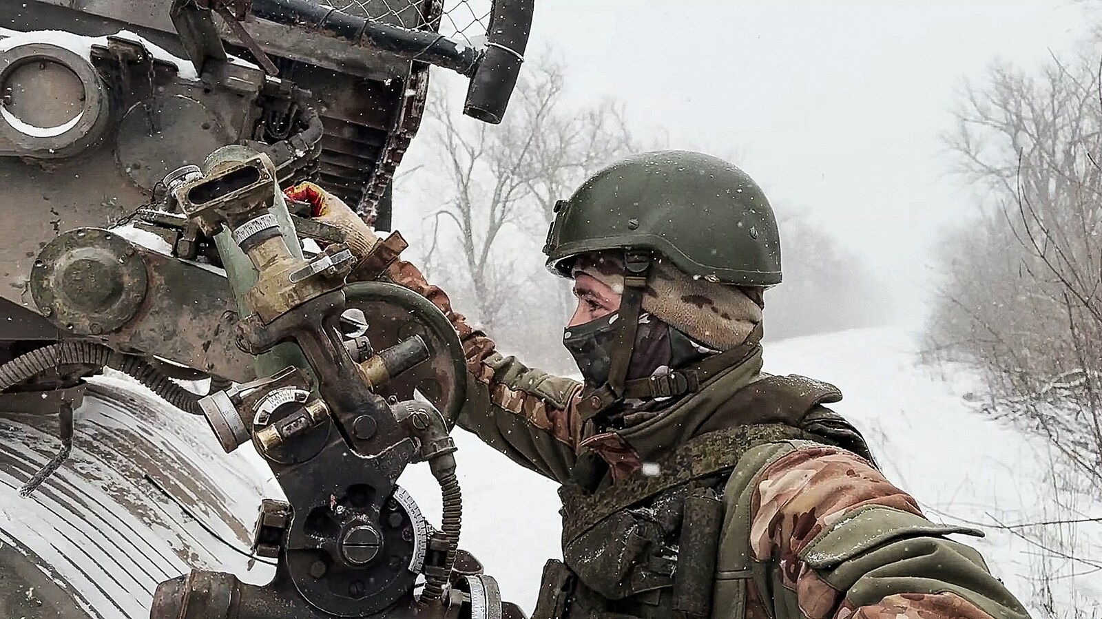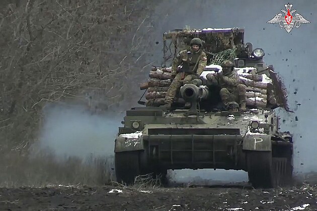 Ruští vojáci jedou na samohybném děle Akacija na blíže neurčeném místě na východě Ukrajiny. (12. února 2025)