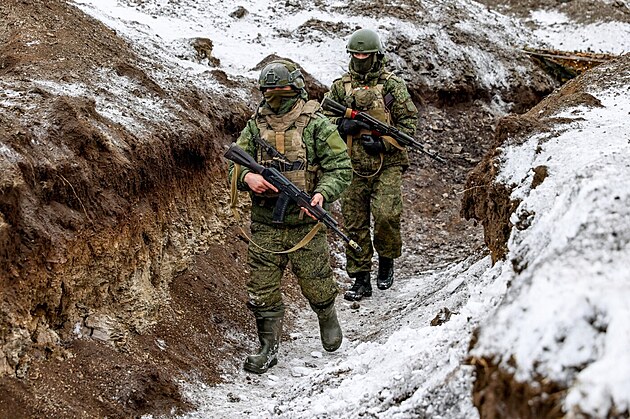 Ruští vojáci během výcviku v okupované Luhanské oblasti na Ukrajině (7. února 2025)
