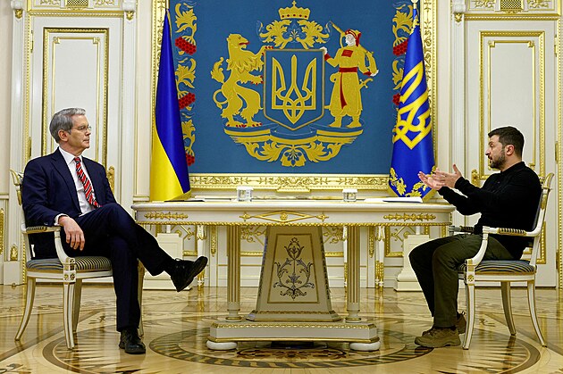 Americký ministr zahraničí Scott Bessent s ukrajinským prezidentem Volodymyrem Zelenským na setkání v Kyjevě.