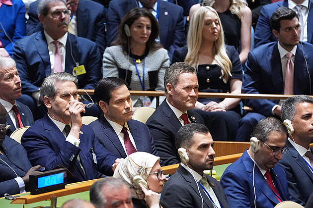 Ministr financí Scott Bessent (vlevo), ministr zahraničí Marco Rubio, velvyslanec USA při OSN Mike Waltz a Tiffany Trumpová (vzadu, druhá zprava) poslouchají prezidenta Donalda Trumpa v OSN. (23. září 2025)
