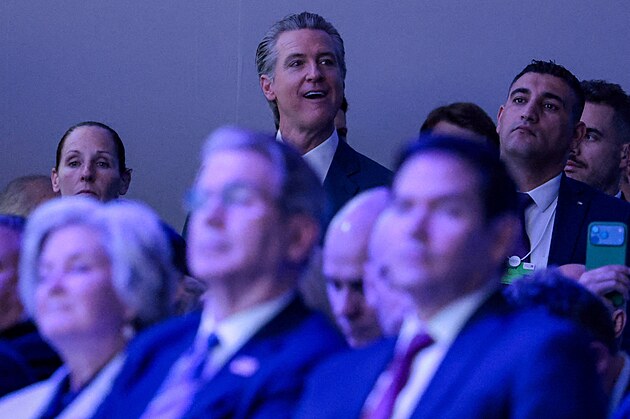 Kalifornský guvernér Gavin Newsom sleduje Trumpův projev na výročním Světovém ekonomickém fóru v Davosu. (21. ledna 2026)